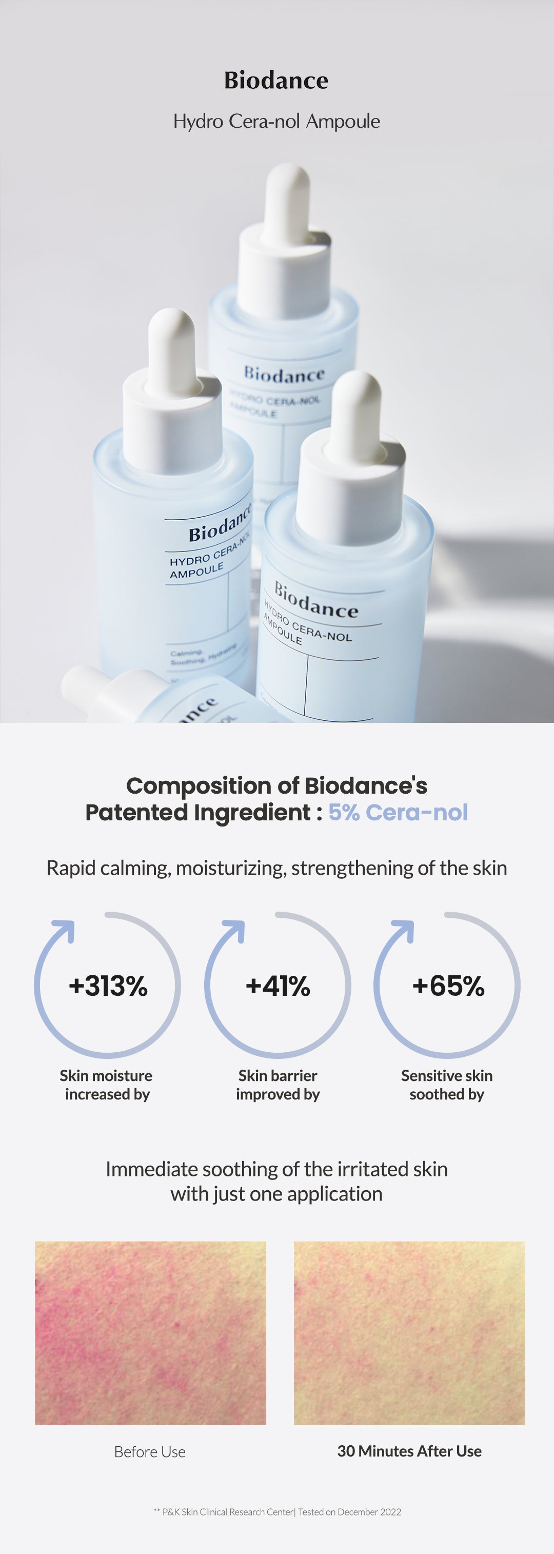 Our Hydro Cera-nol Ampoule is formulated with tiny particles of panthenol(205.3Dalton), which helps the skin absorb the product quickly and spread smoothly on the skin without stickiness.
