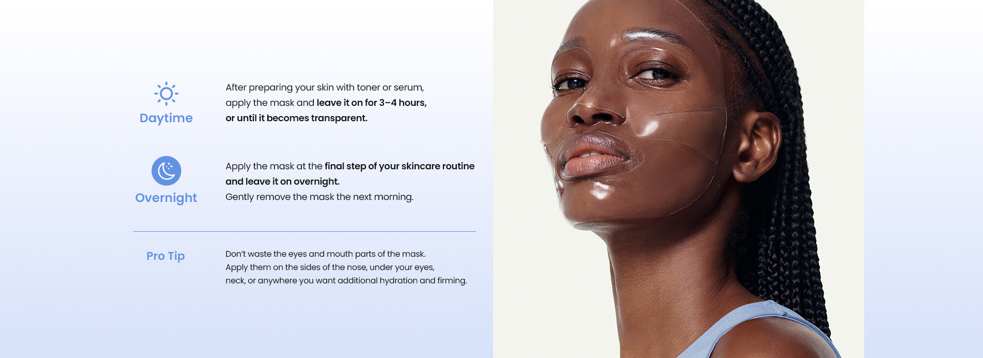 After preparing the skin with toner or serum, apply the mask and leave it on for 3-4 hours or until it becomes transparent.